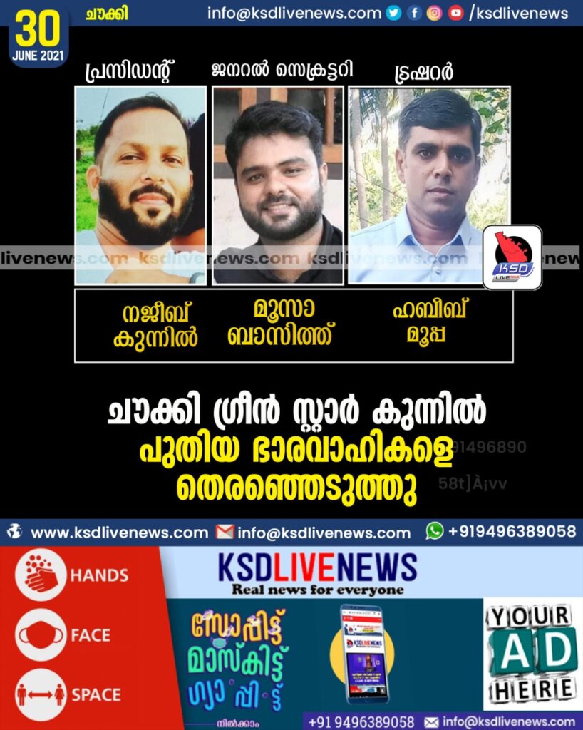 ചൗക്കി: ചൗക്കി ഗ്രീൻ സ്റ്റാർ കുന്നിൽ പുതിയ ഭാരവാഹികളെ തെരഞ്ഞെടുത്തു. വൈസ് പ്രസിഡന്റുമാറായി മുനീസ് ബദർ നഗർ , അപ്പി കുന്നിൽ