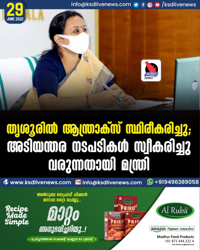 തൃശൂരിൽ ആന്ത്രാക്സ് സ്ഥിരീകരിച്ചു; അടിയന്തര നടപടികള് സ്വീകരിച്ചു വരുന്നതായി മന്ത്രി
