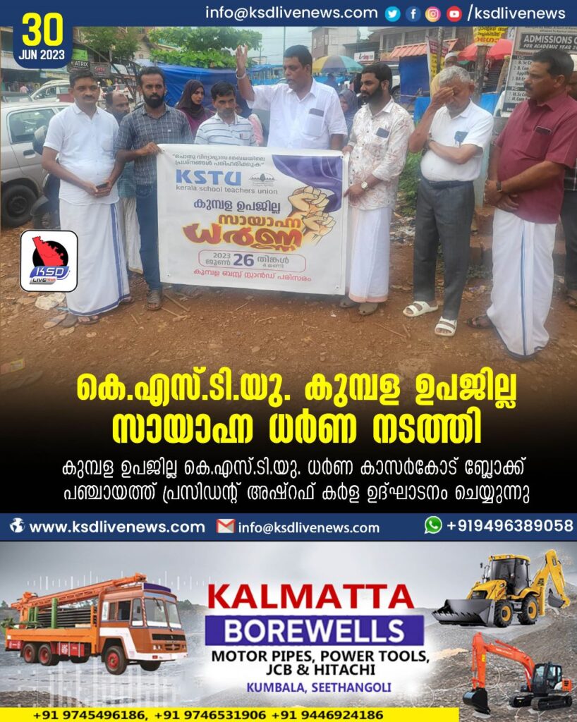 കുമ്പള: പൊതു വിദ്യാഭ്യാസ മേഖലയിലെ പ്രശ്നങ്ങൾ പരിഹരിക്കുക എന്ന ആവശ്യം ഉന്നയിച്ച് വിദ്യാഭ്യാസ അധികൃതർക്ക് നൽകിയ അവകാശ പത്രികയിൽ ഉന്നയിച്ച പ്രശ്നങ്ങൾക്ക് പരിഹാരം കാണണമെന്ന് ആവശ്യപ്പെട്ടുകൊണ്ട് കേരളത്തിൽ ഉടനീളം സംഘടിപ്പിക്കുന്ന ധർണയുടെ ഭാഗമായി കുമ്പള ഉപജില്ല ധർണ കുമ്പള ബസ്റ്റാന്റ് പരിസരത്ത് നടന്നു. കാസർകോട് ബ്ലോക്ക് പഞ്ചായത്ത് സ്റ്റാന്റിംഗ് കമ്മറ്റി ചെയർമാൻ അഷ്റഫ് കർള ഉദ്ഘാടനം ചെയ്തു. ഉപജില്ല പ്രസിഡന്റ് കമാൽ മാസ്റ്റർ അധ്യക്ഷനായി. കുമ്പള ഗ്രാമ പഞ്ചായത്ത് മെമ്പർ യുസുഫ് ഉളുവാർ, ബി.എൻ. മുഹമ്മദലി, ഖലീൽ ബെളിഞ്ചം, ജാഫർ മാസ്റ്റർ, നുഹ്സിന ടീച്ചർ, ഹൈറുന്നിസ ടീച്ചർ, തസ്ലീമ ടീച്ചർ തുടങ്ങിയവർ സംബന്ധിച്ചു.