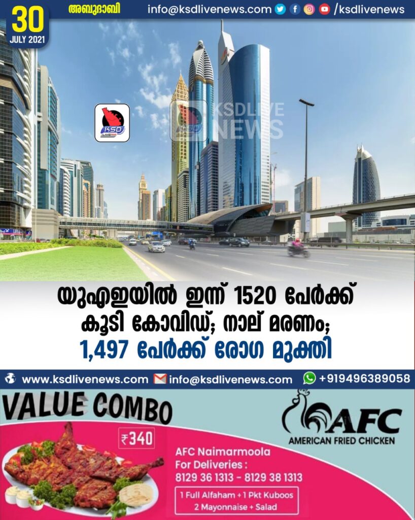 യുഎഇയില് ഇന്ന് 1520 പേര്ക്ക് കൂടി കോവിഡ് ; നാല് മരണം; 1,497 പേർക്ക് രോഗ മുക്തി