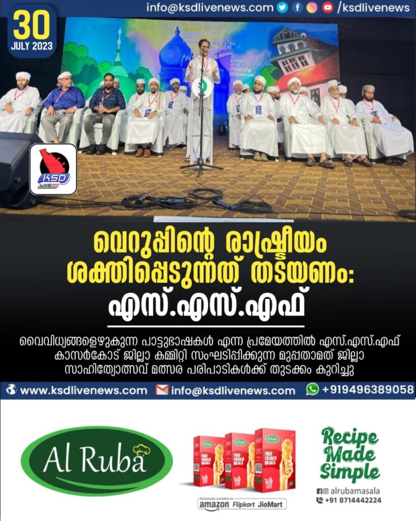 കാസർഗോഡ് : വൈവിധ്യങ്ങളെഴുകുന്ന പാട്ടുഭാഷകൾ എന്ന പ്രമേയത്തിൽ എസ് എസ് എഫ് കാസർകോട് ജില്ലാ കമ്മിറ്റി സംഘടിപ്പിക്കുന്ന മുപ്പതാമത് ജില്ലാ സാഹിത്യോത്സവ് മത്സര പരിപാടികൾക്ക് തുടക്കം കുറിച്ചു. എം എൽ എ അഡ്വക്കേറ്റ് സി എച്ച് കുഞ്ഞംബു ഉദ്ഘാടനം ചെയ്തു. വെറുപ്പും വിദ്വേഷവും വ്യാപിപ്പിക്കാനുള്ള തീവ്രശ്രമങ്ങൾ നമുക്ക് ചുറ്റിലും നടക്കുന്നുണ്ട്. രാഷ്ട്രീയ ലാഭങ്ങൾക്കായി വിഭജനത്തിന്റെ രാഷ്ട്രീയം പയറ്റുകയാണ് ഫാസിസ്റ്റുകൾ – അവയെ എതിർത്ത് തോൽപ്പിക്കാൻ കേരളത്തിലെ മതനിരപേക്ഷ സമൂഹത്തിനാകണമെന്ന് എസ് എസ് എഫ് മുൻ സംസ്ഥാന സെക്രട്ടറി കെ ബി ബഷീർ പ്രസ്താവിച്ചു. എസ്എസ്എഫ് കാസർകോട് ജില്ലാ സാഹിത്യോത്സവിൽ സാംസ്കാരിക പ്രഭാഷണം നടത്തുകയായിരുന്നു അദ്ധേഹം.