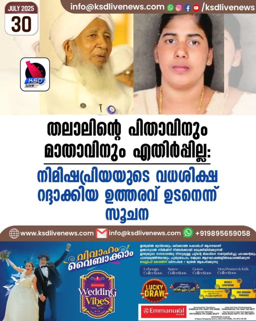 തലാലിന്റെ പിതാവിനും മാതാവിനും എതിർപ്പില്ല; നിമിഷപ്രിയയുടെ വധശിക്ഷ റദ്ദാക്കിയ ഉത്തരവ് ഉടനെന്ന് സൂചന