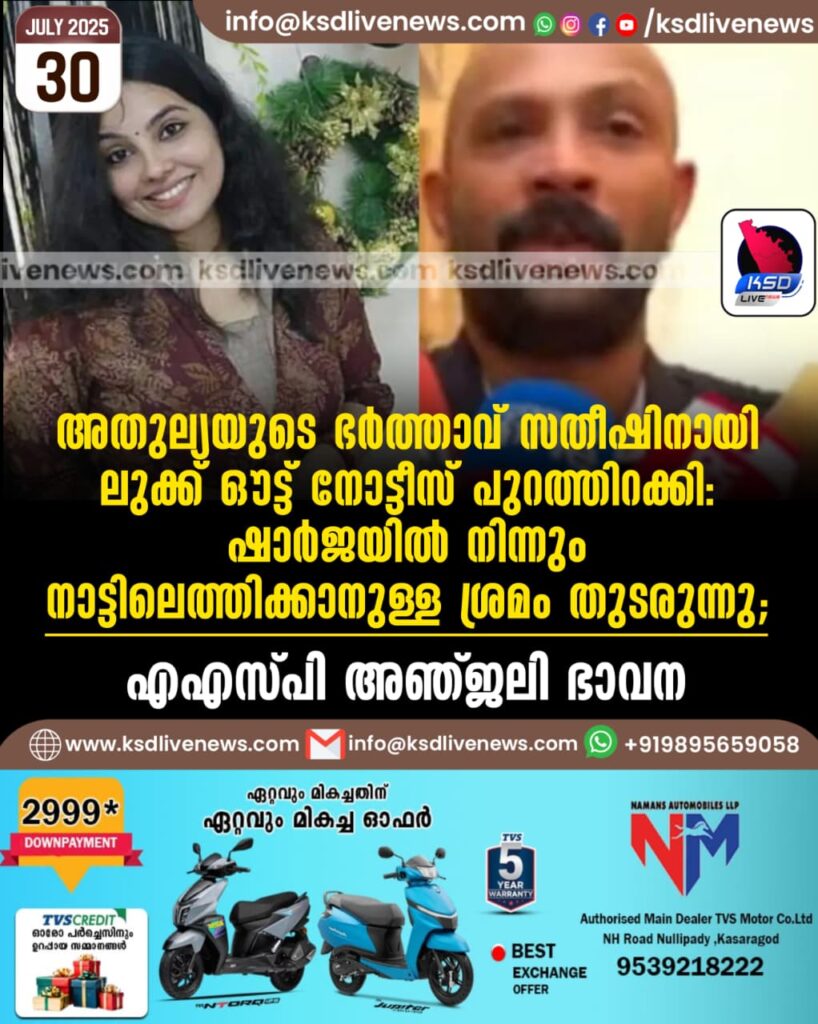 അതുല്യയുടെ ഭര്‍ത്താവ് സതീഷിനായി ലുക്ക് ഔട്ട് നോട്ടീസ് പുറത്തിറക്കി: ഷാര്‍ജയില്‍ നിന്നും നാട്ടിലെത്തിക്കാനുള്ള ശ്രമം തുടരുന്നു; എഎസ്‍പി അഞ്ജലി ഭാവന