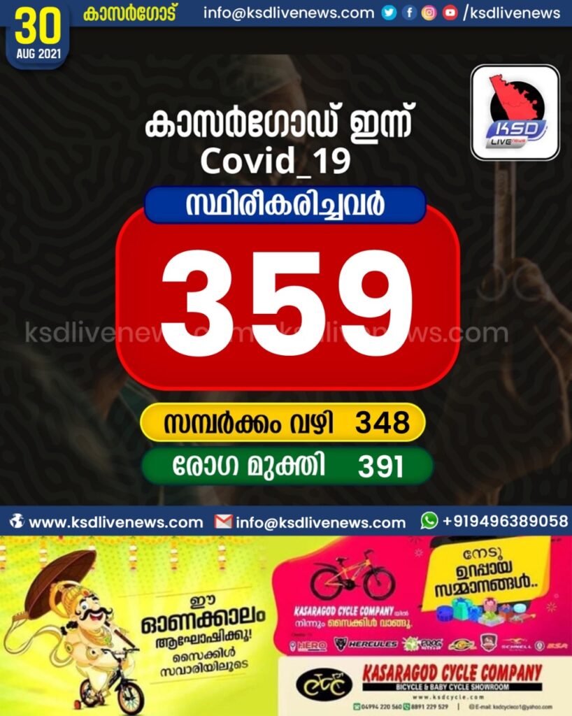കാസർഗോഡ് ജില്ലയിൽ ഇന്ന് 359 പേർക്ക് കോവിഡ് സ്ഥിരീകരിച്ചു. സമ്പർക്കം വഴി 348 പേർക്കും. 391 പേർക്ക് രോഗമുക്തി