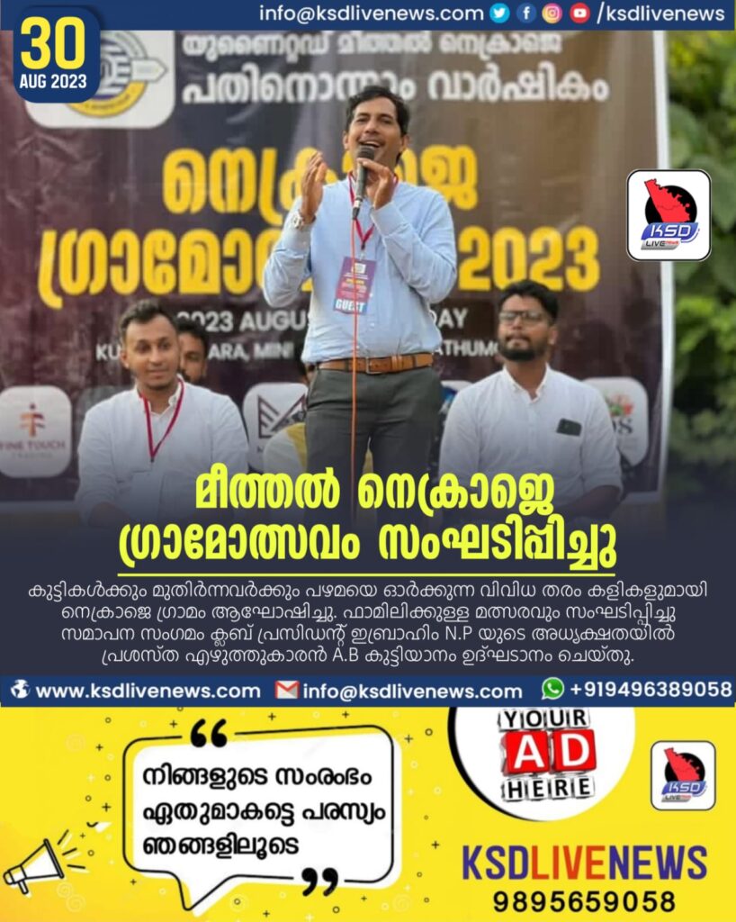 മീത്തൽ നെക്രാജെ: കലാ കായിക സാംസ്കാരിക രംഗത്ത് മുന്നേറിക്കൊണ്ടിരിക്കുന്ന ‘യുനൈറ്റഡ് മീത്തൽ നെക്രാജെ’യുടെ നേത്രത്വത്തിൽ നെക്രാജെ ഗ്രാമോത്സവം സംഘടിപ്പിച്ചു. കുട്ടികൾക്കും മുതിർന്നവർക്കും പഴമയെ ഓർക്കുന്ന വിവിധ തരം കളികളുമായി നെക്രാജെ ഗ്രാമം ആഘോഷിച്ചു.ഫാമിലിക്കുള്ള മത്സരവും സംഘടിപ്പിച്ചു. സമാപന സംഗമം ക്ലബ് പ്രസിഡന്റ് ഇബ്രാഹിം N P യുടെ അധ്യക്ഷതയിൽ പ്രശസ്ത എഴുത്തുകാരൻ A B കുട്ടിയാനം ഉദ്ഘടാനം ചെയ്തു. Dr അബ്ദുല്ല മുഹ്സിൻ ഹവാസ് മുഖ്യാതിഥി ആയിരുന്നു. MBBS പരീക്ഷയിൽ ഉന്നത വിജയം കരസ്ഥമാക്കിയ Dr മുഹ്സിൻ ഹവാസിനുള്ള യുനൈറ്റഡ് മീത്തൽ നെക്രാജെ യുടെ സ്നേഹോപഹാരം പ്രശസ്ത എഴുത്തുകാരൻ A B കുട്ടിയാനം ഹവാസിന് കൈമാറി. ചെങ്കള പഞ്ചായത്ത് അഞ്ചാം വാർഡ് മെമ്പർ ലത്തീഫ് സി കെ,മുസ്തഫ N M,യൂസഫ് YN,സൈഫുദ്ധീൻ N H,മുസവ്വിർ,ഷിയാബ് P M,ആസിഫ് C H,ഖലീൽ K N,അബൂബക്കർ I N,കബീർ MRC,മൈഷാദ് S K,ജാഫർ I N’അംപ്പു Y N എന്നിവർ ആശംസ പ്രസംഗം നടത്തി.മത്സരത്തിൽ പങ്കെടുത്ത കുട്ടികൾക്കുള്ള സമ്മാനം വിതരണം ചെയ്തു. ക്ലബ് സെക്രെട്ടറി റിയാസ് ടി എൻ സ്വാഗതവും ഖജാൻജി അബ്ദുല്ല N S നന്ദിയും പറഞ്ഞു.