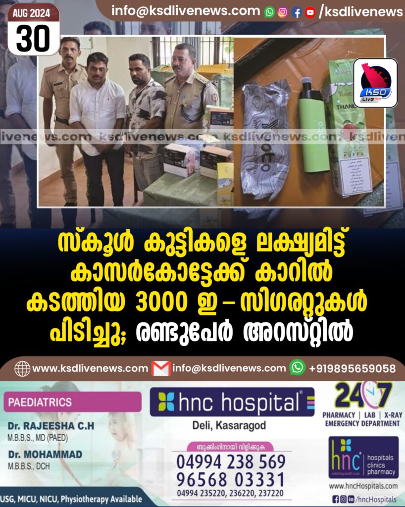 സ്കൂൾ കുട്ടികളെ ലക്ഷ്യമിട്ട് കാസര്കോട്ടേക്ക് കാറിൽ കടത്തിയ 3000 ഇ-സിഗരറ്റുകള് പിടിച്ചു; രണ്ടുപേര് അറസ്റ്റില്