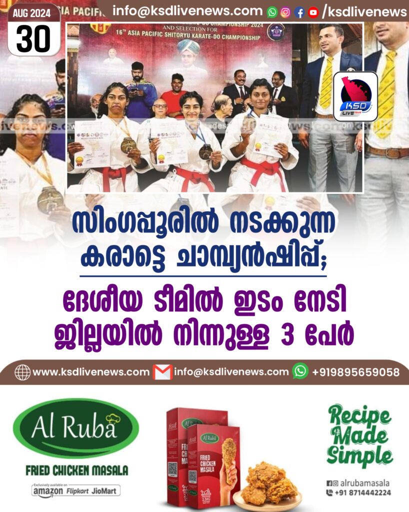 സിംഗപ്പൂരില് നടക്കുന്ന കരാട്ടെ ചാമ്പ്യന്ഷിപ്പ്: ദേശീയ ടീമില് ഇടം നേടി ജില്ലയില് നിന്നുള്ള 3 പേര്