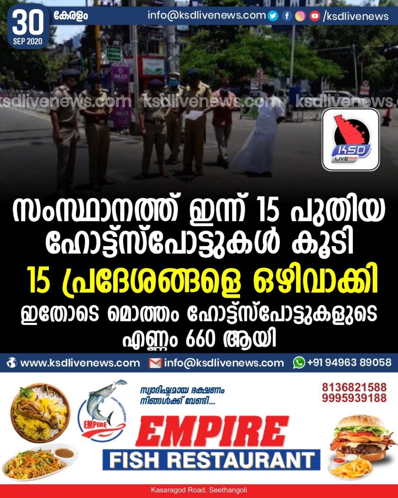 സംസ്ഥാനത്ത് ഇന്ന് 15 പുതിയ ഹോട്ട്സ്പോട്ടുകള് കൂടി; 15 പ്രദേശങ്ങളെ ഒഴിവാക്കി.ഇതോടെ മൊത്തം ഹോട്ട്സ്പോട്ടുകളുടെ എണ്ണം 660 ആയി.