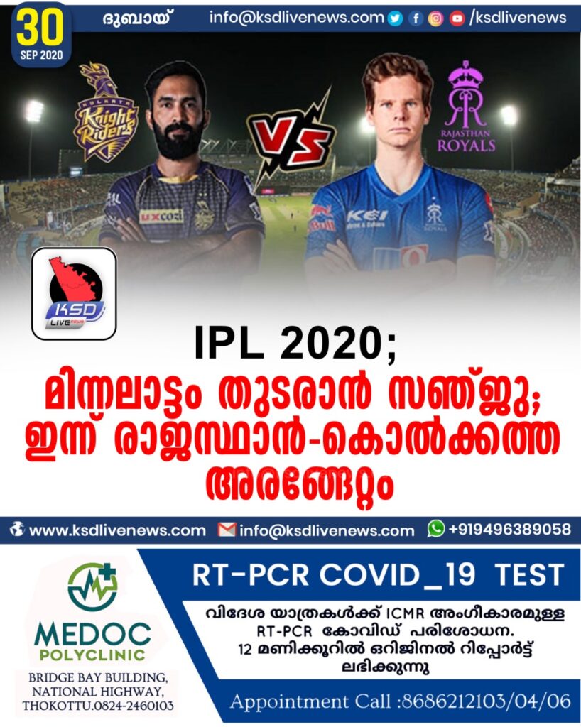 IPL 2020 ; മിന്നലാട്ടം തുടരാൻ സഞ്ജു ; ഇന്ന് രാജസ്ഥാൻ – കൊൽക്കത്ത അരങ്ങേറ്റം
