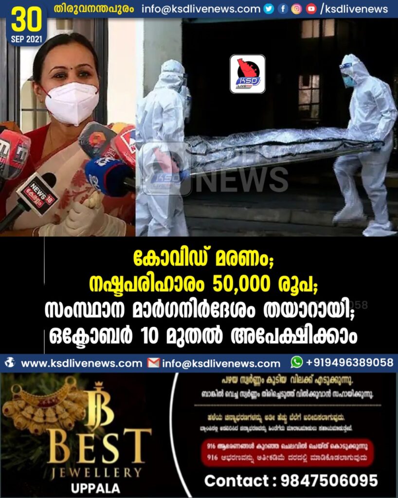 കൊവിഡ് മരണം: നഷ്ടപരിഹാരം 50,000 രൂപ; സംസ്ഥാന മാർഗനിർദേശം തയാറായി, ഒക്ടോബർ 10 മുതൽ അപേക്ഷിക്കാം