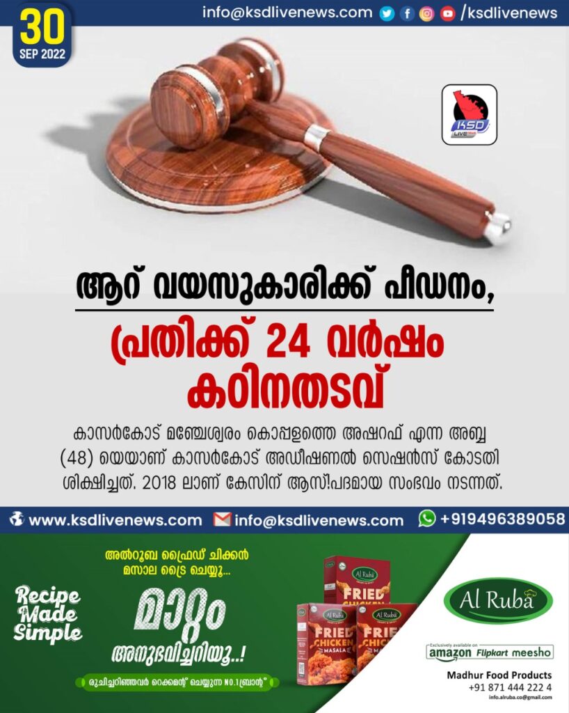 കാസര്കോട്: ആറ് വയസുകാരിയെ പീഡിപ്പിച്ച പോക്സോ കേസിലെ പ്രതിക്ക് 24 വര്ഷം കഠിന തടവ്. രണ്ട് ലക്ഷം രൂപ പിഴയും ഒടുക്കണം. കാസര്കോട് മഞ്ചേശ്വരം കൊപ്പളത്തെ അഷറഫ് എന്ന അബ്ബ (48) യെയാണ് കാസര്കോട് അഡീഷണല് സെഷന്സ് കോടതി ശിക്ഷിച്ചത്. 2018 ലാണ് കേസിന് ആസ്പദമായ സംഭവം നടന്നത്.