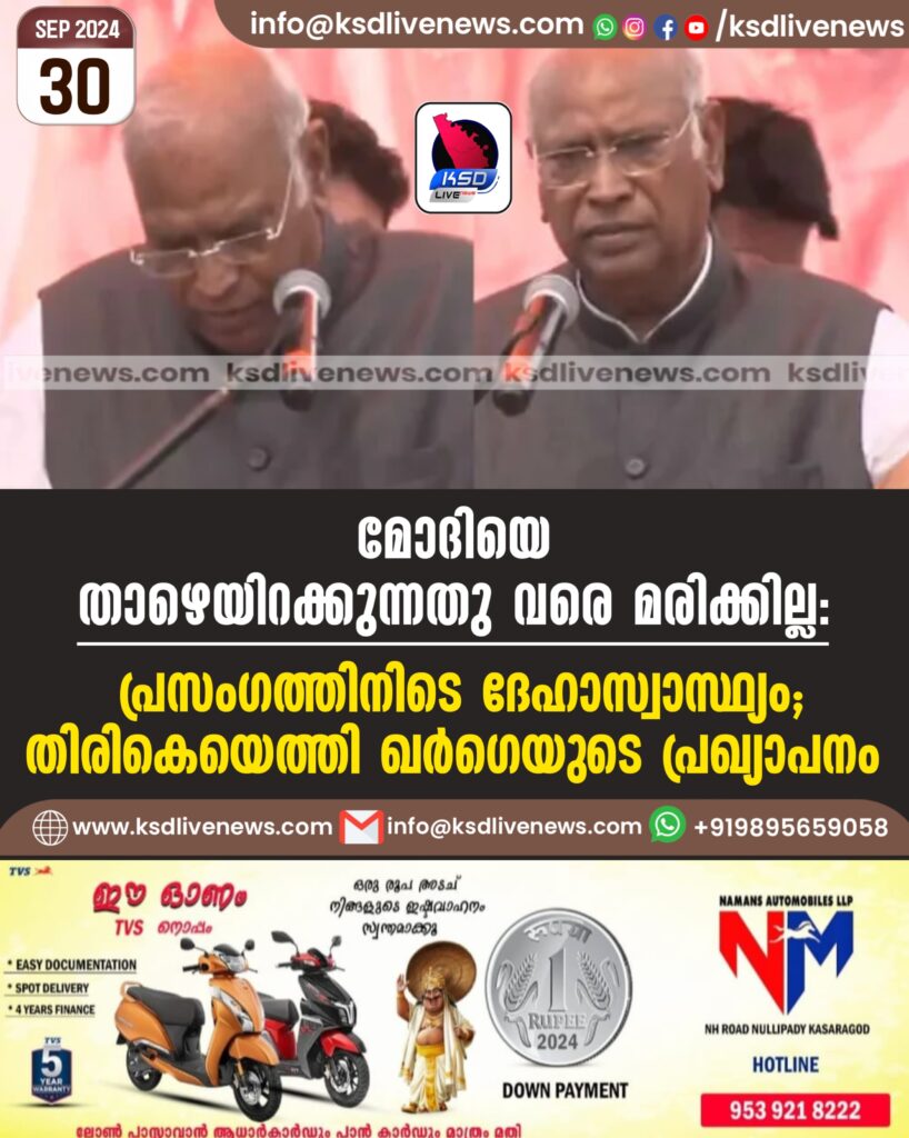 മോദിയെ താഴെയിറക്കുന്നതു വരെ മരിക്കില്ല’: പ്രസംഗത്തിനിടെ ദേഹാസ്വാസ്ഥ്യം, തിരികെയെത്തി ഖർഗെയുടെ പ്രഖ്യാപനം- വിഡിയോ