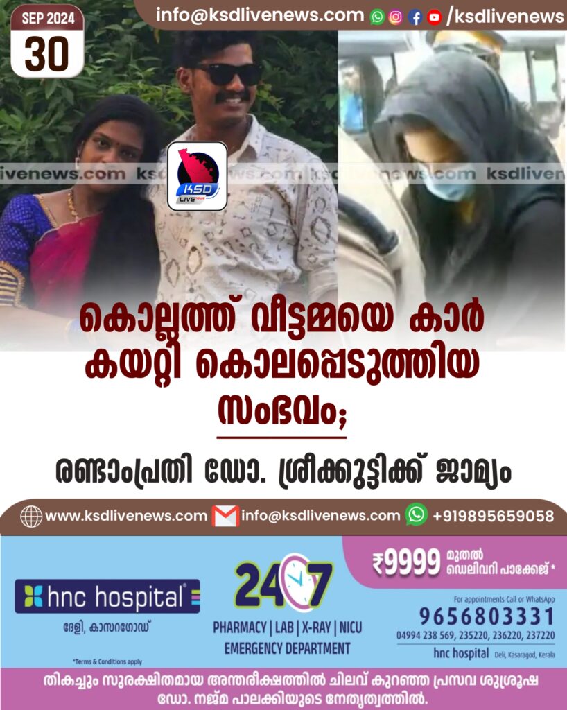 കൊല്ലത്ത് വീട്ടമ്മയെ കാര് കയറ്റി കൊലപ്പെടുത്തിയ സംഭവം: രണ്ടാംപ്രതി ഡോ. ശ്രീക്കുട്ടിക്ക് ജാമ്യം