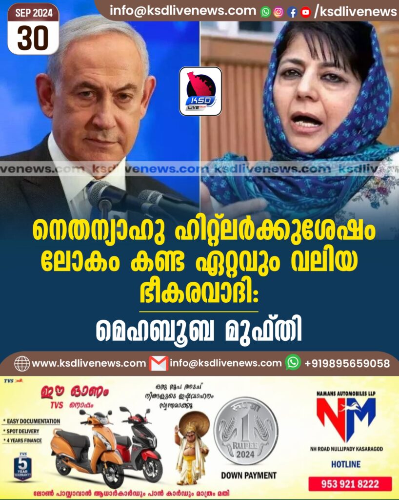 നെതന്യാഹു ഹിറ്റ്ലര്ക്കുശേഷം ലോകം കണ്ട ഏറ്റവും വലിയ ഭീകരവാദി: മെഹബൂബ മുഫ്തി
