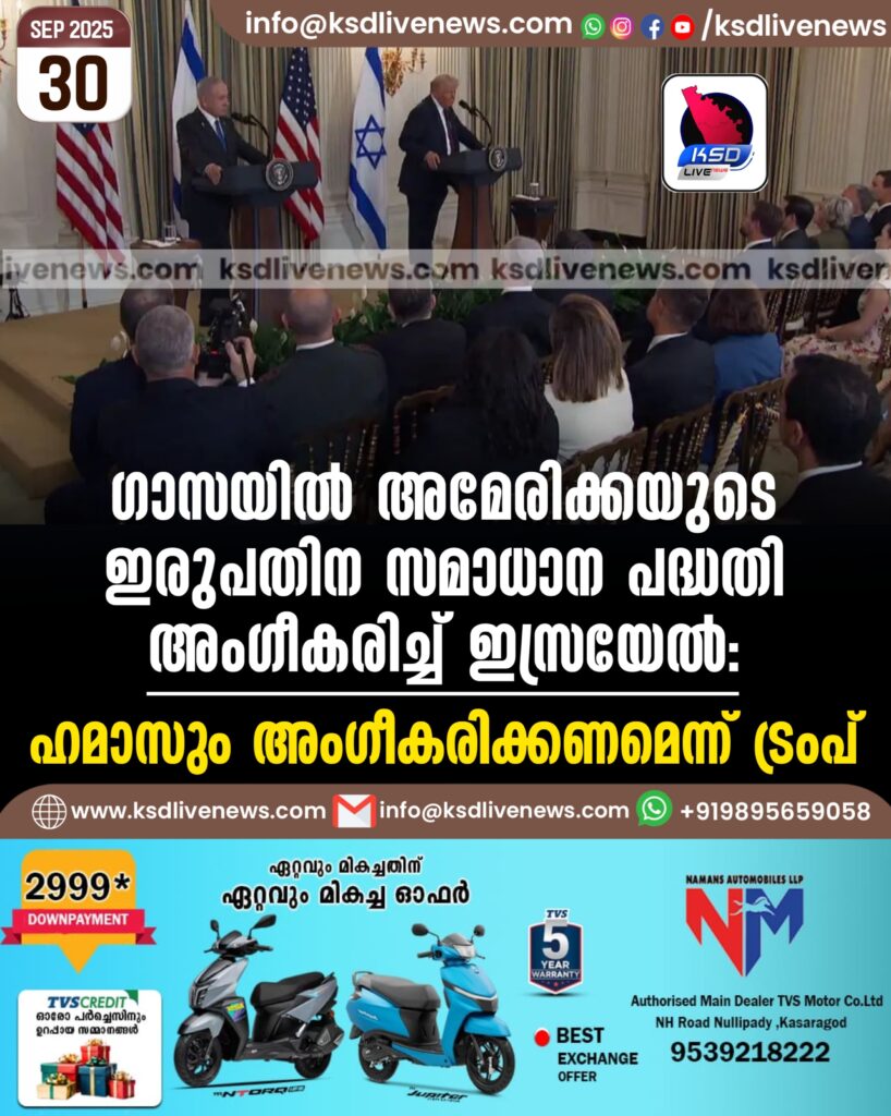 ഗാസയില്‍ അമേരിക്കയുടെ ഇരുപതിന സമാധാന പദ്ധതി അംഗീകരിച്ച്‌ ഇസ്രയേല്‍: ഹമാസും അംഗീകരിക്കണമെന്ന് ട്രംപ്