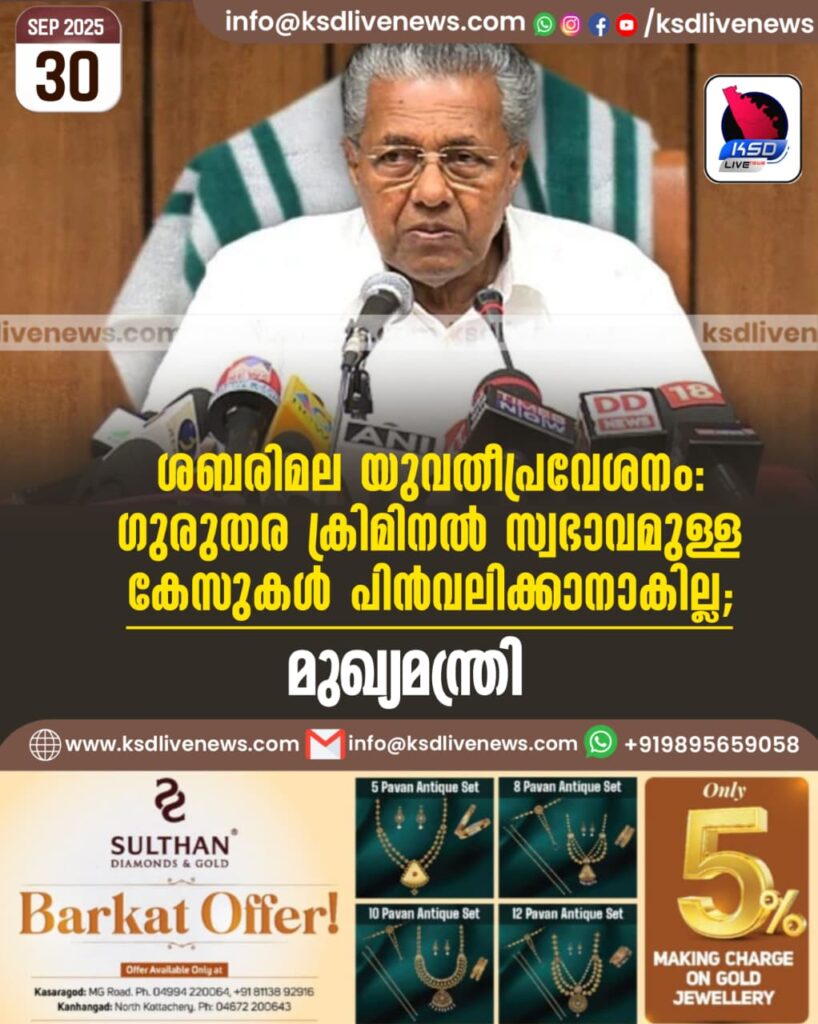 ശബരിമല യുവതീപ്രവേശനം: ഗുരുതര ക്രിമിനല് സ്വഭാവമുള്ള കേസുകള് പിന്വലിക്കാനാകില്ല; മുഖ്യമന്ത്രി