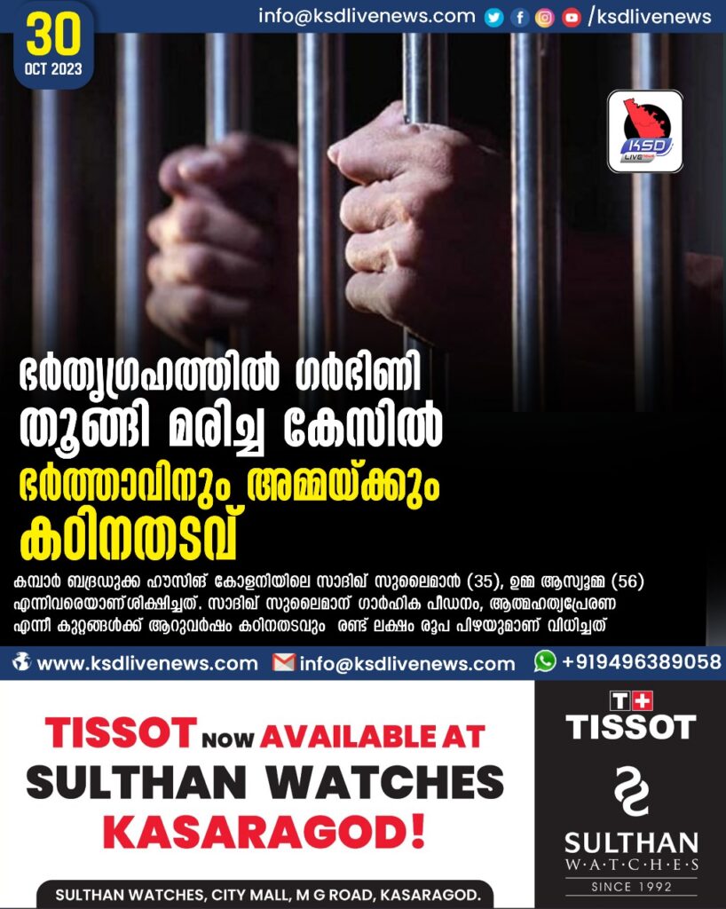 കമ്പാർ ബദ്രഡുക്ക ഹൗസിങ് കോളനിയിലെ സാദിഖ് സുലൈമാൻ (35), ഉമ്മ ആസ്യൂമ്മ (56) എന്നിവരെയാണ്ശിക്ഷിച്ചത്. സാദിഖ് സുലൈമാന് ഗാർഹിക പീഡനം, ആത്മഹത്യപ്രേരണ എന്നീ കുറ്റങ്ങൾക്ക് ആറുവർഷം കഠിനതടവും രണ്ട് ലക്ഷം രൂപ പിഴയുമാണ് വിധിച്ചത്. പിഴയടച്ചില്ലെങ്കിൽ ഒരുവർഷം കൂടി തടവ് അനുഭവിക്കണം. ഉമ്മ ആസ്യൂമ്മക്ക് ഗാർഹികപീഡനം, ആത്മഹത്യാപ്രേരണ എന്നീ കുറ്റങ്ങൾക്ക് രണ്ടുവർഷം കഠിനതടവും രണ്ടുലക്ഷം രൂപപിഴയും വിധിച്ചു. പിഴയടച്ചില്ലെങ്കിൽ നാലുമാസം അധികതടവും അനുഭവിക്കണം. പ്രോസിക്യൂഷനുവേണ്ടി അഡീഷണൽ ഗവ. പ്ലീഡർ ഇ ലോഹിതാക്ഷൻ ഹാജരായി