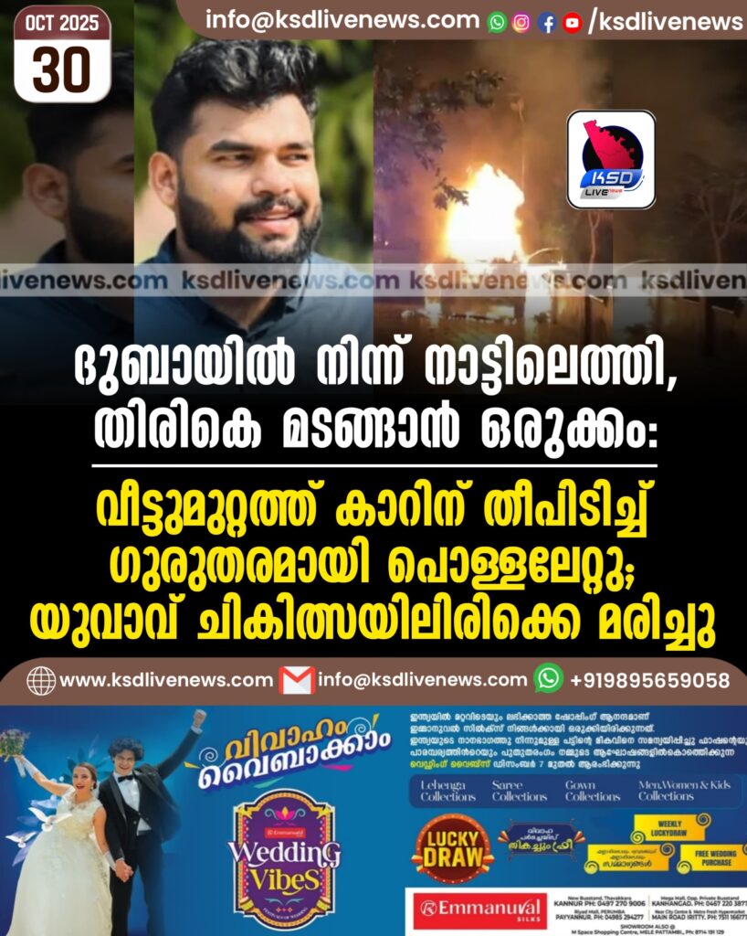 ദുബായിൽ നിന്ന് നാട്ടിലെത്തി, തിരികെ മടങ്ങാൻ ഒരുക്കം; വീട്ടുമുറ്റത്ത് കാറിന് തീപിടിച്ച് ഗുരുതരമായി പൊള്ളലേറ്റു; യുവാവ് ചികിത്സയിലിരിക്കെ മരിച്ചു