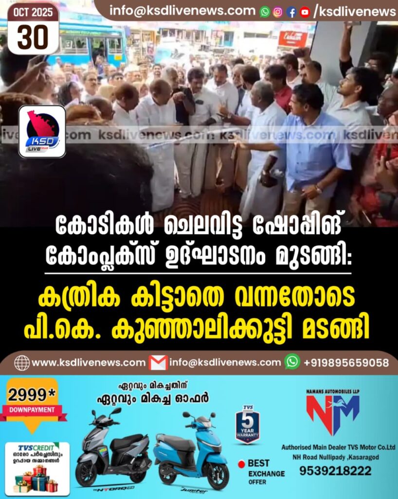 കോടികള് ചെലവിട്ട ഷോപ്പിങ് കോംപ്ലക്സ് ഉദ്ഘാടനം മുടങ്ങി: കത്രിക കിട്ടാതെ വന്നതോടെ പി.കെ. കുഞ്ഞാലിക്കുട്ടി മടങ്ങി