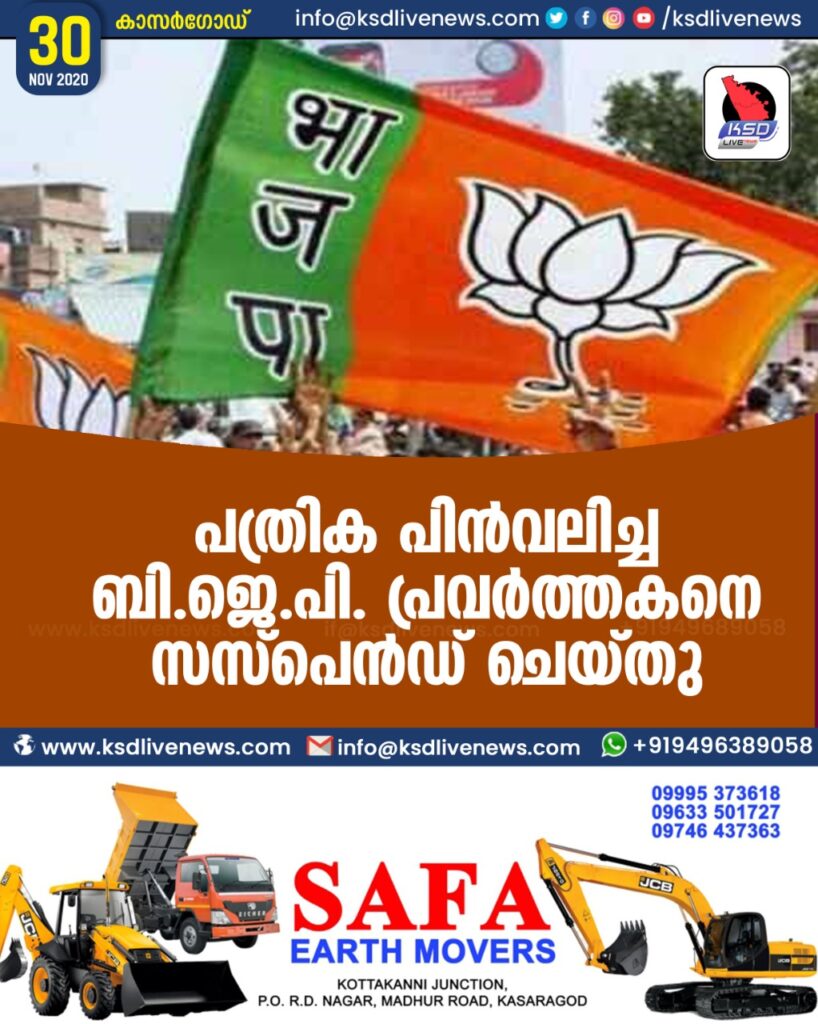 പത്രിക പിൻവലിച്ച ബി.ജെ.പി. പ്രവർത്തകനെ സസ്പെൻഡ് ചെയ്തു