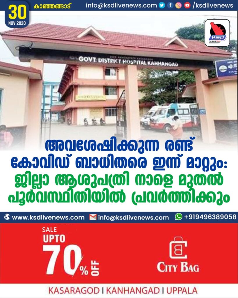 അവശേഷിക്കുന്ന രണ്ട് കോവിഡ് ബാധിതരെ ഇന്ന് മാറ്റും: ജില്ലാ ആശുപത്രി നാളെ മുതൽ പൂർവസ്ഥിതിയിൽ പ്രവർത്തിക്കും