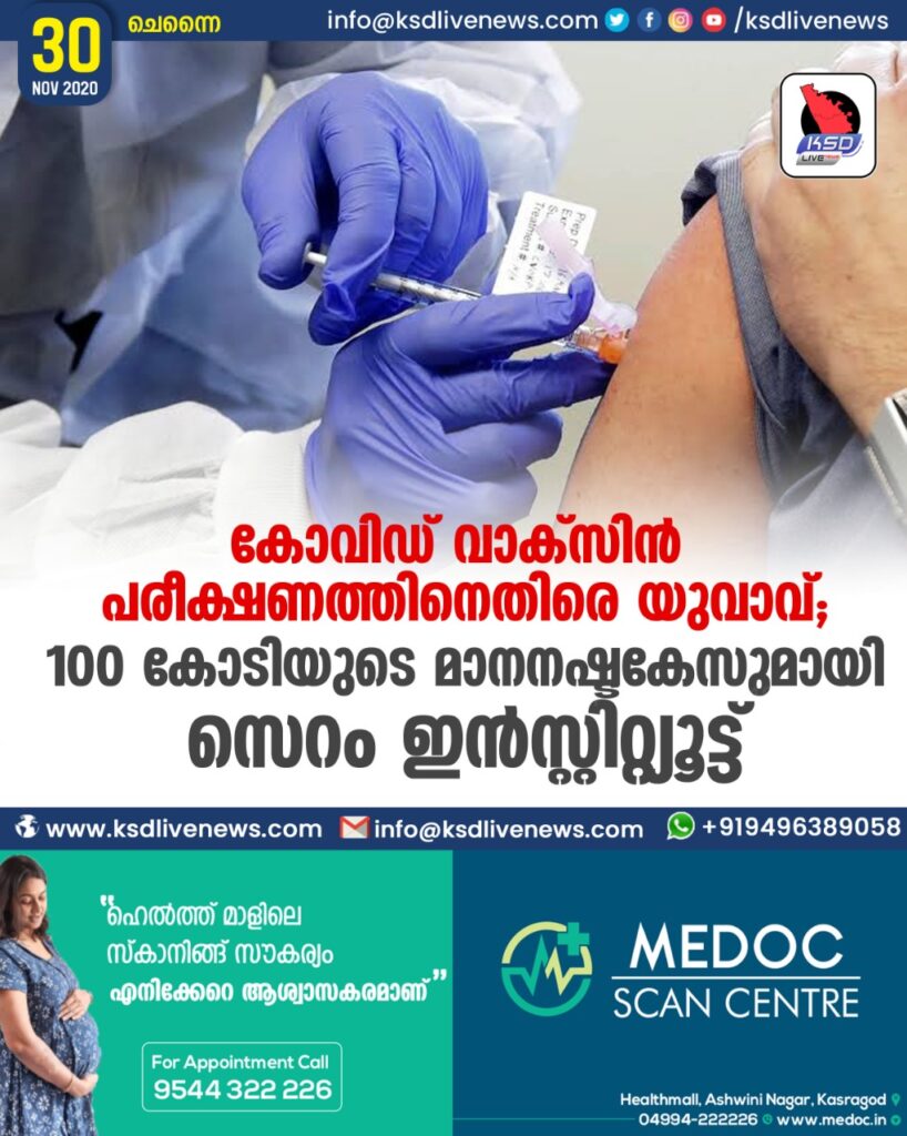 കോവിഡ് വാക്സിന് പരീക്ഷണത്തിനെതിരെ യുവാവ്; 100 കോടിയുടെ മാനനഷ്ടകേസുമായി സെറം ഇന്സ്റ്റിറ്റ്യൂട്ട്
