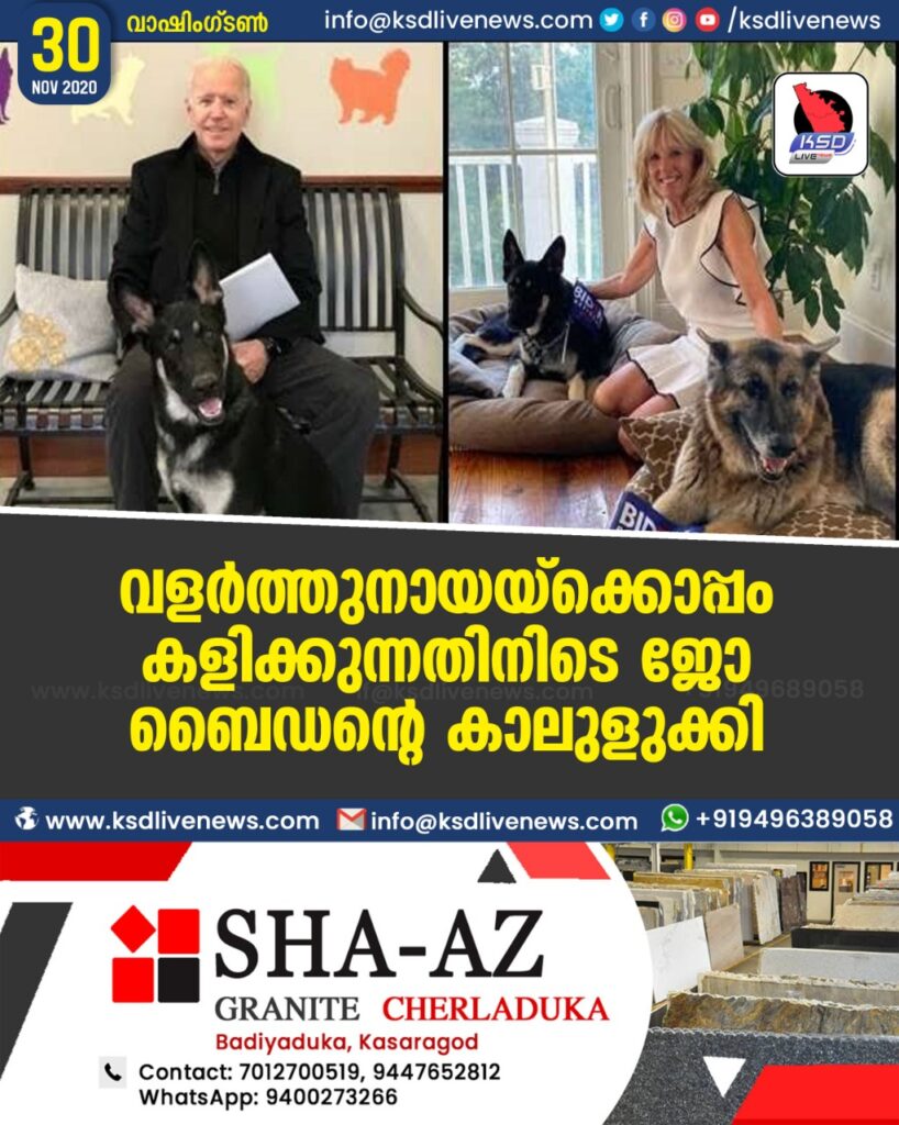 വാഷിങ്ടൺ: നിയുക്ത അമേരിക്കൻ പ്രസിഡന്റ് ജോ ബൈഡന്റെ കാലുളുക്കി. മേജർ എന്ന വളർത്തുനായയ്ക്കൊപ്പം കളിക്കുന്നതിനിടെയാണ് അദ്ദേഹത്തിന് പരിക്കേറ്റത്. അതേസമയം ബൈഡന്റെ എല്ലുകൾക്ക് പൊട്ടലുകളില്ലെന്ന് അദ്ദേഹത്തിന്റെ ഓഫീസ് അറിയിച്ചു.