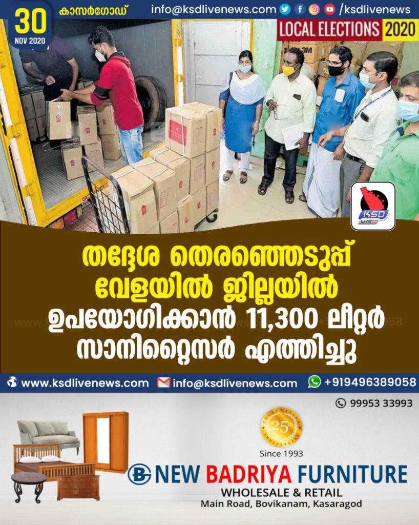 തദ്ദേശ തെരഞ്ഞെടുപ്പ് വേളയിൽ ജില്ലയിൽ ഉപയോഗിക്കാന് 11,300 ലീറ്റർ സാനിറ്റൈസർ എത്തിച്ചു