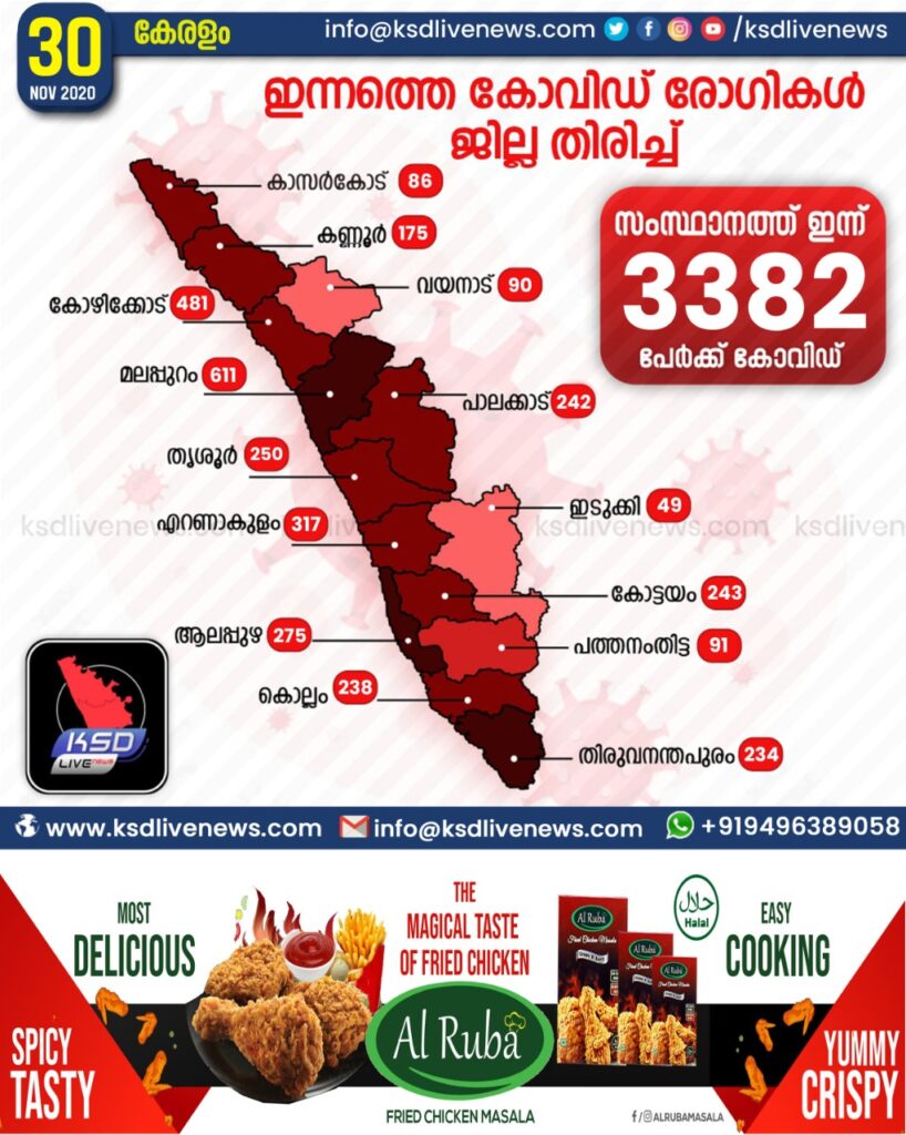തിരുവനന്തപുരം:തിരുവനന്തപുരം: കേരളത്തില് ഇന്ന് 3382 പേര്ക്ക് കോവിഡ്-19 സ്ഥിരീകരിച്ചതായി മുഖ്യമന്ത്രി പിണറായി വിജയന്. മലപ്പുറം 611, കോഴിക്കോട് 481, എറണാകുളം 317, ആലപ്പുഴ 275, തൃശൂര് 250, കോട്ടയം 243, പാലക്കാട് 242, കൊല്ലം 238, തിരുവനന്തപുരം 234, കണ്ണൂര് 175, പത്തനംതിട്ട 91, വയനാട് 90, കാസര്ഗോഡ് 86, ഇടുക്കി 49 എന്നിങ്ങനേയാണ് ജില്ലകളില് ഇന്ന് രോഗ ബാധ സ്ഥിരീകരിച്ചത്.