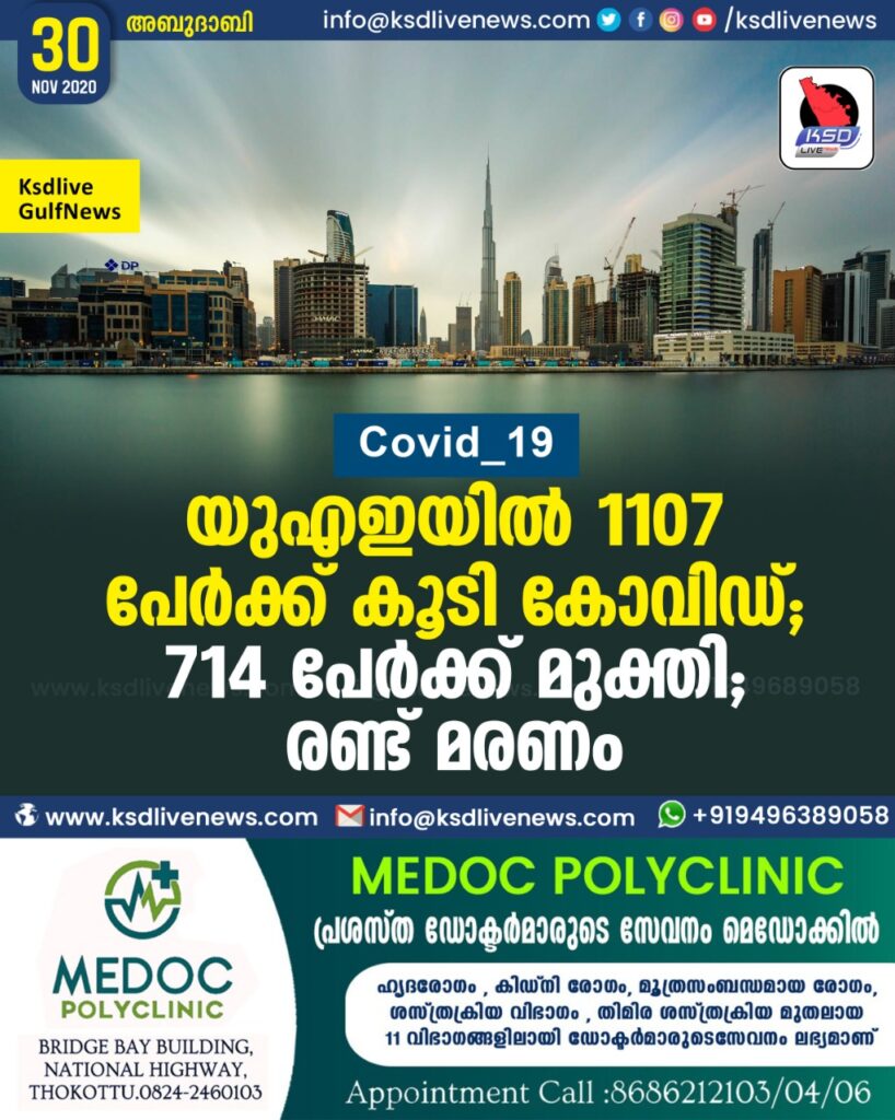 യുഎഇയില്‍ 1107 പേര്‍ക്ക് കൂടി കോവിഡ് ; 714 പേർക്ക് മുക്തി ; രണ്ട് മരണം