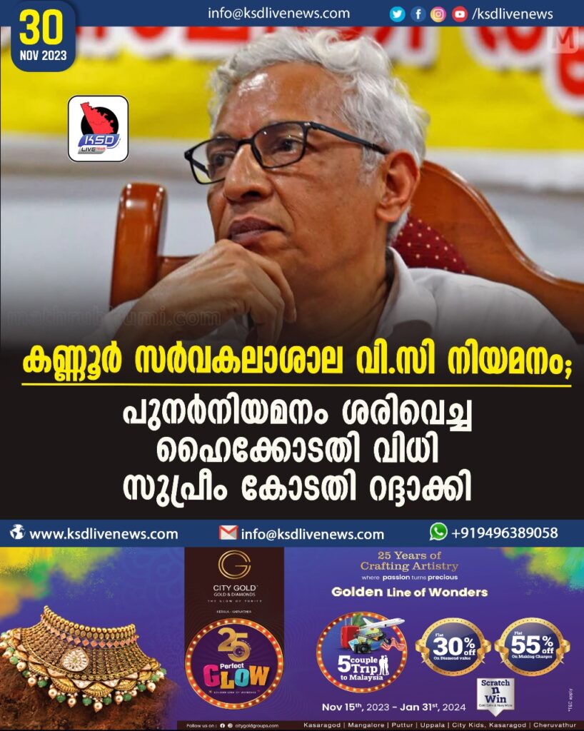 കണ്ണൂർ സർവകലാശാല വി.സി നിയമനം; പുനർനിയമനം ശരിവെച്ച ഹൈക്കോടതി വിധി സുപ്രീം കോടതി റദ്ദാക്കി