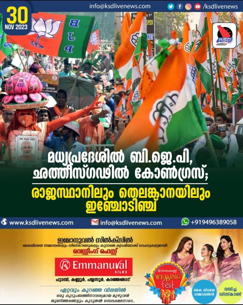 മധ്യപ്രദേശില് ബിജെപി, ഛത്തീസ്ഗഢില് കോണ്ഗ്രസ്; രാജസ്ഥാനിലും തെലങ്കാനയിലും ഇഞ്ചോടിഞ്ച്
