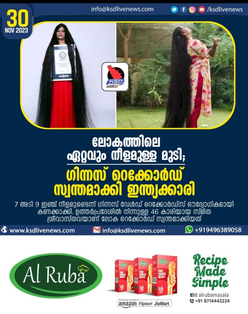 ലോകത്തിലെ ഏറ്റവും നീളമുള്ള മുടിക്കുള്ള ഗിന്നസ് വേൾഡ് റെക്കോർഡ് സ്വന്തമാക്കി ഇന്ത്യക്കാരി. 7 അടി 9 ഇഞ്ച് നീളമുണ്ടെന്ന് ഗിന്നസ് വേൾഡ് റെക്കോർഡ്സ് ഔദ്യോഗികമായി കണക്കാക്കി. ഉത്തർപ്രദേശിൽ നിന്നുള്ള 46 കാരിയായ സ്മിത ശ്രീവാസ്തവയാണ് ലോക റെക്കോർഡ് സ്വന്തമാക്കിയത്