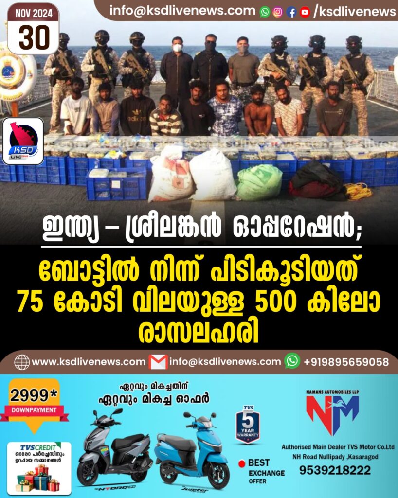ഇന്ത്യ-ശ്രീലങ്കന് ഓപ്പറേഷന്; ബോട്ടില് നിന്ന് പിടികൂടിയത് 75 കോടി വിലയുള്ള 500 കിലോ രാസലഹരി