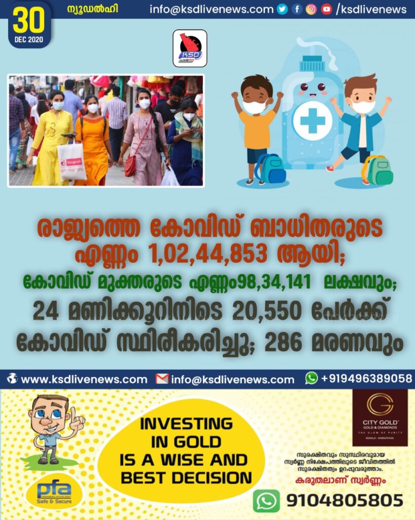 രാജ്യത്തെ കോവിഡ് ബാധിതരുടെ എണ്ണം 1,02,44,853 ആയി ; കോവിഡ് മുക്തരുടെ എണ്ണം98,34,141 ലക്ഷവും ;