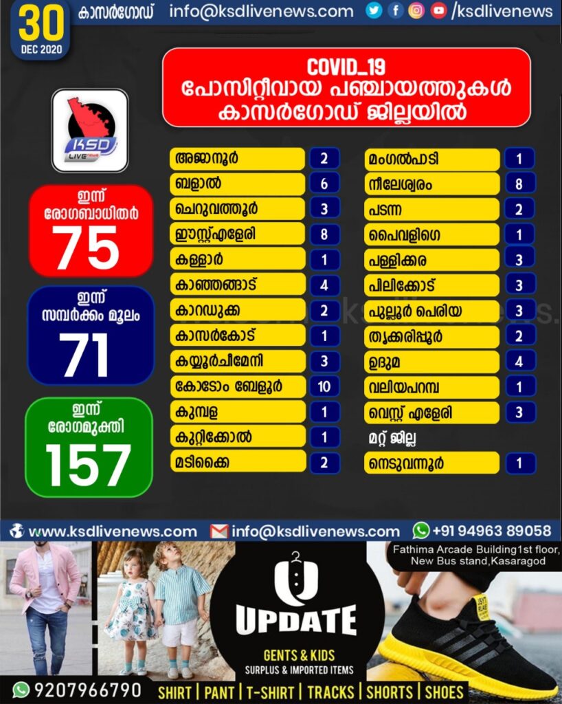 കാസർഗോഡ് ജില്ലയിൽ ഇന്ന് കോവിഡ് സ്ഥിരീകരിച്ചവരുടെ പഞ്ചായത്ത് തിരിച്ചുള്ള സ്ഥിതി വിവര കണക്ക്