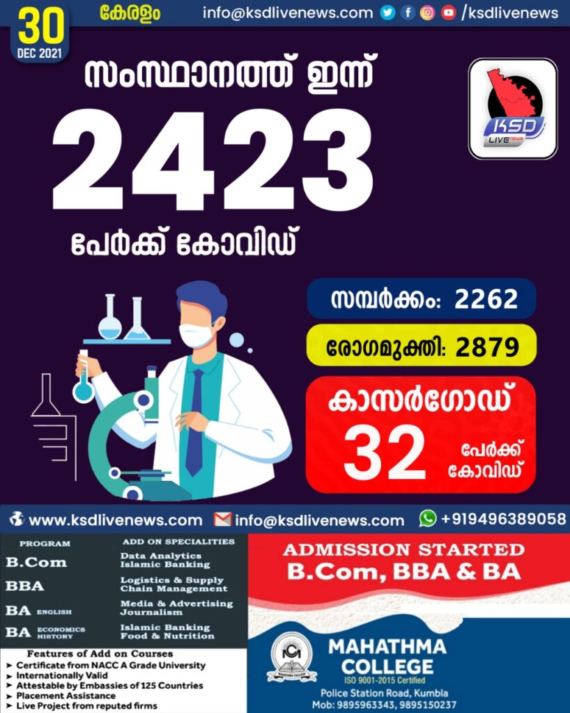 സംസ്ഥാനത്ത് ഇന്ന് 2423 പേർക്ക് കോവിഡ് സ്ഥിരീകരിച്ചു. സമ്പർക്കം വഴി 2262 പേർക്കും ; ആശ്വാസമായി 2879 പേർക്ക് രോഗ മുക്തിയും ; കാസർഗോഡ് ജില്ലയിൽ 32 പേർക്ക് പുതിയ കോവിഡ് കേസുകൾ ; മരണം 15