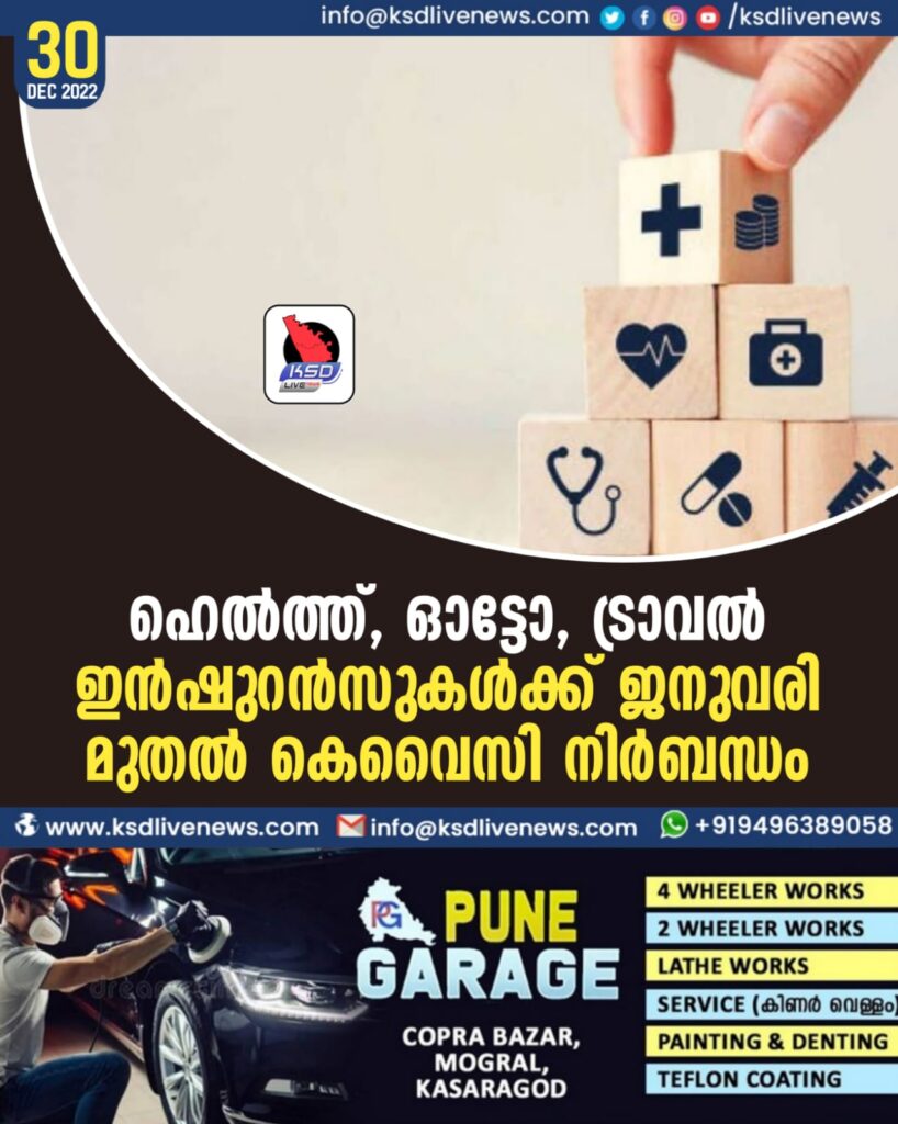 എല്ലാ ഇന്‍ഷുറന്‍സ് പോളിസികള്‍ക്കും കെവൈസി നിര്‍ബന്ധമാക്കുന്നു. ജനുവരി ഒന്നു മുതല്‍ എടുക്കുന്ന ആരോഗ്യ, വാഹന, ട്രാവല്‍, ഹോം ഇന്‍ഷുറന്‍സ് പോളിസികള്‍ക്ക് പുതിയ നിബന്ധന ബാധകമാകും.