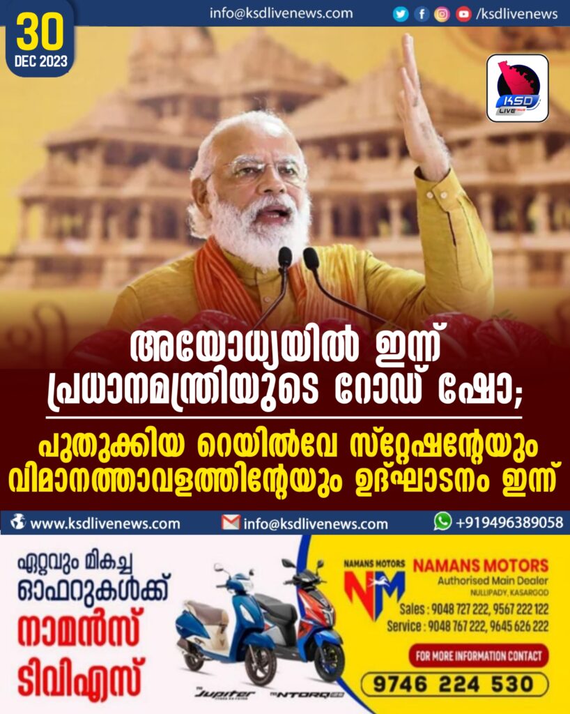 അയോധ്യയില് ഇന്ന് പ്രധാനമന്ത്രിയുടെ റോഡ് ഷോ; പുതുക്കിയ റെയില്വേ സ്റ്റേഷന്റേയും വിമാനത്താവളത്തിന്റേയും ഉദ്ഘാടനം ഇന്ന്