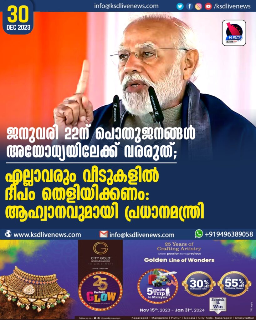 ജനുവരി 22ന് പൊതുജനങ്ങൾ അയോധ്യയിലേക്ക് വരരുത്; എല്ലാവരും വീടുകളിൽ ദീപം തെളിയിക്കണം: ആഹ്വാനവുമായി പ്രധാനമന്ത്രി