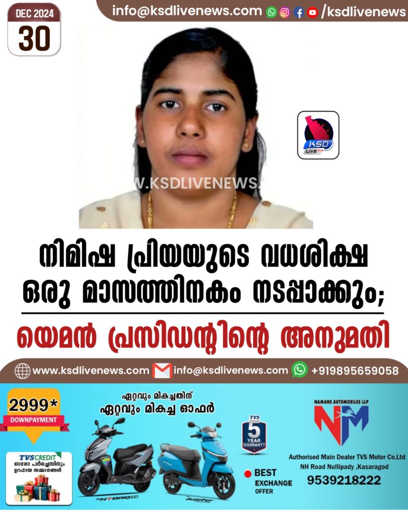 നിമിഷ പ്രിയയുടെ വധശിക്ഷ ഒരു മാസത്തിനകം നടപ്പാക്കും; യെമന് പ്രസിഡന്റിന്റെ അനുമതി