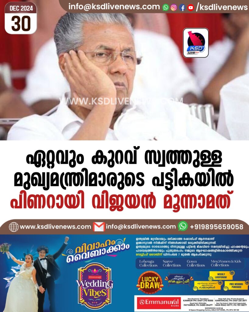 ഏറ്റവും കുറവ് സ്വത്തുള്ള മുഖ്യമന്ത്രിമാരുടെ പട്ടികയില് പിണറായി വിജയന് മൂന്നാമത്