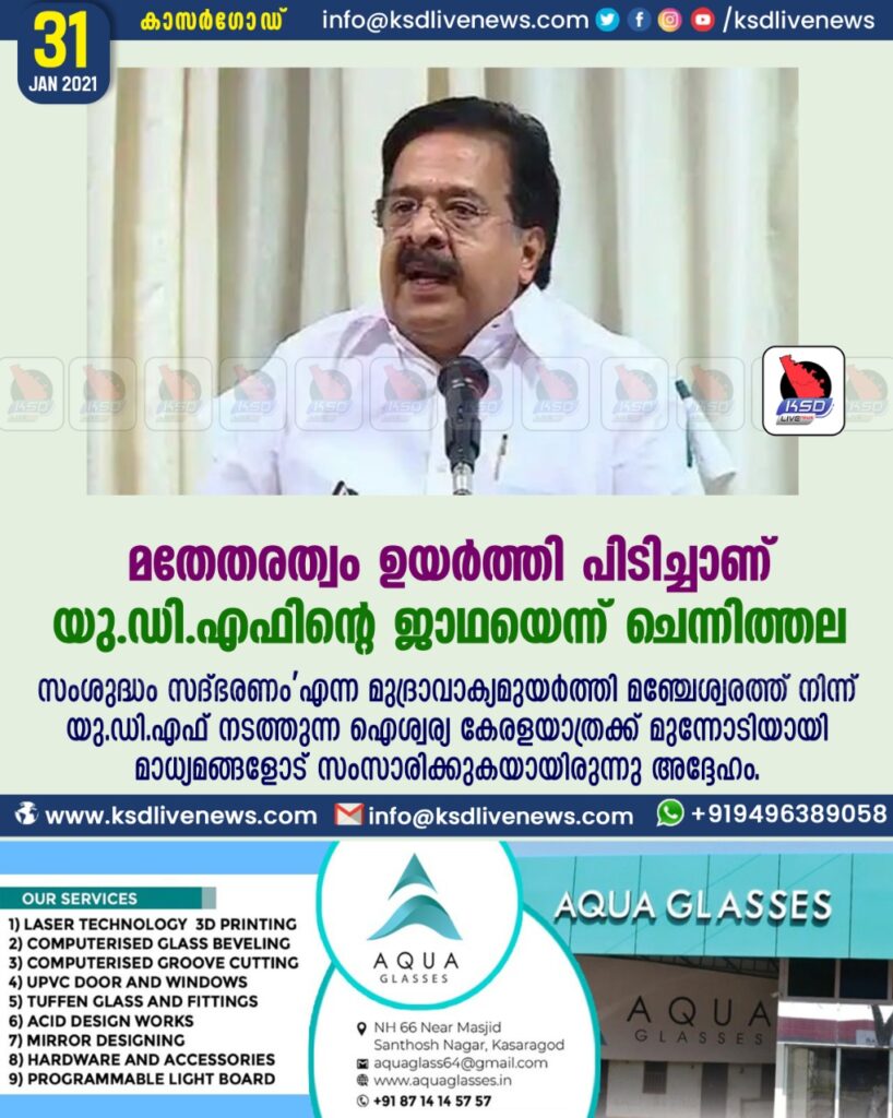കാസര്‍കോട്: മതേതരത്വം ഉയര്‍ത്തിപിടിച്ചാണ് യു.ഡി.എഫിന്‍റെ ജാഥയെന്ന് പ്രതിപക്ഷ നേതാവ് രമേശ് ചെന്നിത്തല. ‘സംശുദ്ധം സദ്ഭരണം’എന്ന മുദ്രാവാക്യമുയര്‍ത്തി മഞ്ചേശ്വരത്ത് നിന്ന് യു.ഡി.എഫ് നടത്തുന്ന ഐശ്വര്യ കേരളയാത്രക്ക് മുന്നോടിയായി മാധ്യമങ്ങളോട് സംസാരിക്കുകയായിരുന്നു അദ്ദേഹം.