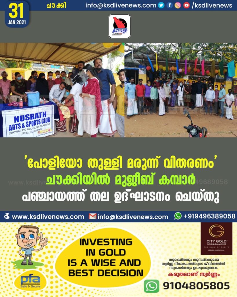 ചൗക്കി : മൊഗ്രാൽപുത്തൂർ ഗ്രാമപഞ്ചായത്തിൻ്റെയും കുടുംബാരോഗ്യ കേന്ദ്രത്തിൻ്റെയും ചൗക്കി നുസ്രത്ത് ക്ലബ്ബിൻ്റെയും സംയുക്താഭിമുഖ്യത്തിൽ പൾസ് പോളിയോ തുള്ളി വിതരണം ആരംഭിച്ചു, ഗ്രാമ പഞ്ചായത്ത് വൈ .. പ്രസിഡണ്ട് മുജീബ് കമ്പാർ ഉൽഘാടനം ചെയ്തു.സ്റ്റാൻഡിങ്ങ് കമ്മിറ്റി ചെയർപെർസൺ പ്രമീള മജൽ അധ്യക്ഷത വഹിച്ചു.വാർഡ് മെമ്പർ ഷമീമ സാദിഖ് സ്വാഗതം പറഞ്ഞു.മെഡിക്കൽ ഓഫീസർ ഡോ ജാസ്മിൻ., എച്.ഐ. ജെ.എച്ച്.ഐ.രഞീവ് രാഗ വൻ.. മായിൻ.കുന്നിൽ. കരീം ചൗക്കി. മഹമൂദ് കുലങ്കര.ഹമീദ് എസ്.എച്..അനീഫ് കടപ്പുരം. ഹമീദ് പദിഞാർ.സാദിഖ് കടപ്പു രം .സത്താർ ബി.എച്ച്.. ക്ലബ്ബ് ഭാരവാഹികളായ ഹമീദ് രാക്.സകീർ കെ കെ.അഹ്‌മദ്‌ മില്ല.ഷാനിദ് കൊടക് .അസ്‌കർ ചൗ ക്കി.സിദ്ദീക് .സാജിദ്. തുടങ്ങിയവർ സംബന്ധിച്ചു …