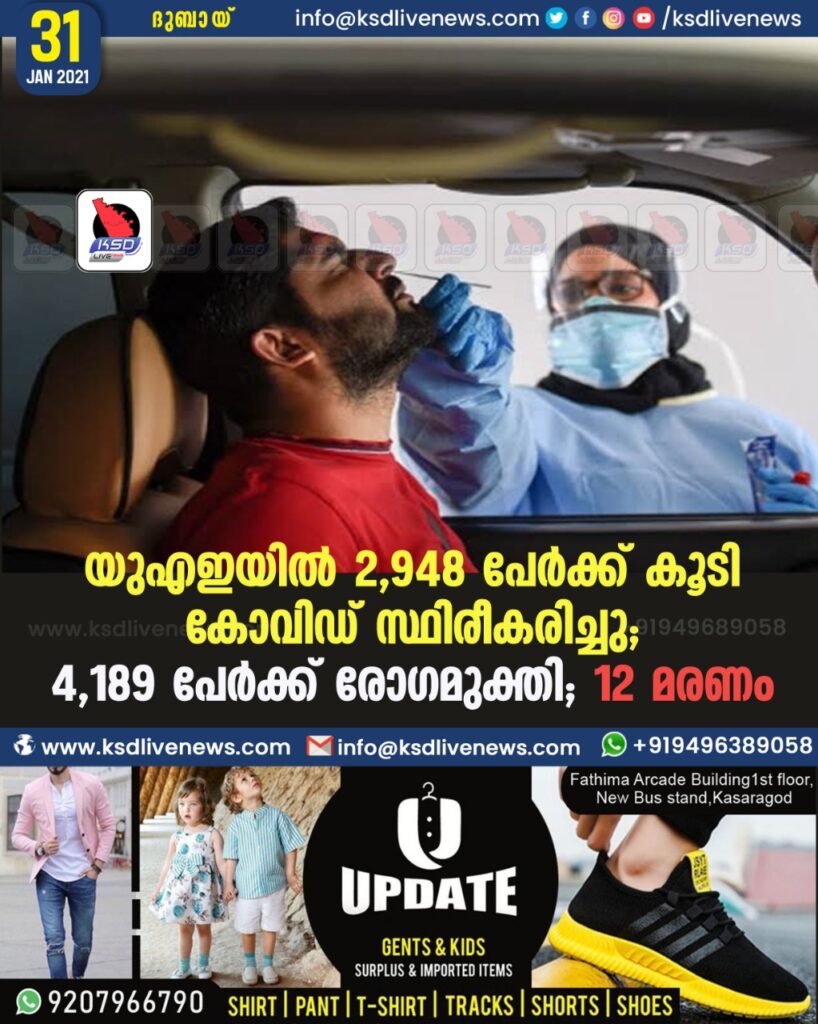 യുഎഇയില് 2,948 പേര്ക്ക് കൂടി കോവിഡ് സ്ഥിരീകരിച്ചു; 4,189 പേർക്ക് രോഗമുക്തി; 12 മരണം
