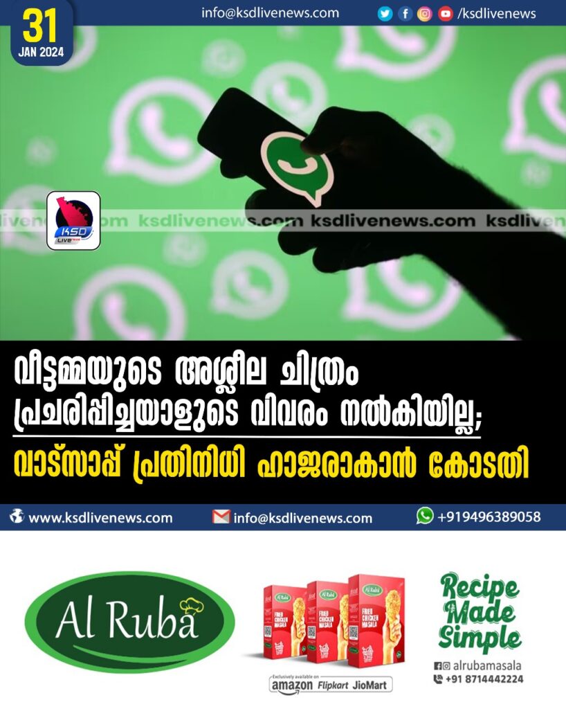 വീട്ടമ്മയുടെ അശ്ലീലചിത്രം പ്രചരിപ്പിച്ചയാളുടെ വിവരംനല്‍കിയില്ല;വാട്സാപ്പ് പ്രതിനിധി ഹാജരാകാന്‍ കോടതി