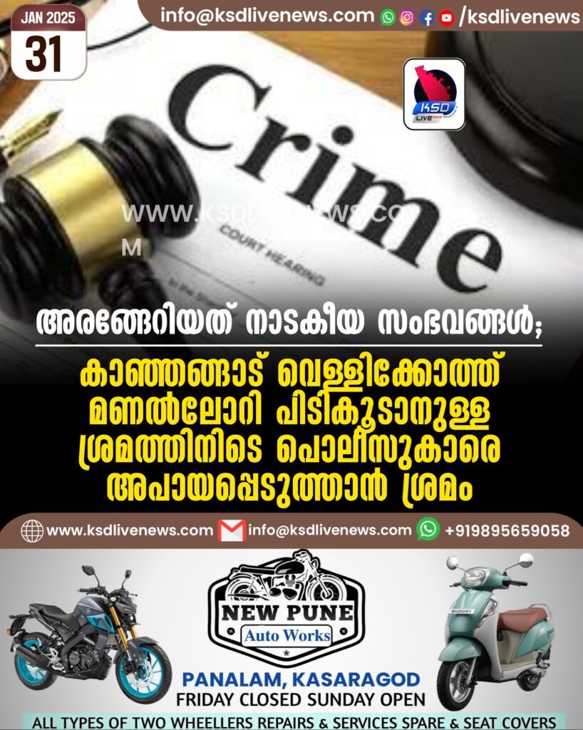 അരങ്ങേറിയത് നാടകീയ സംഭവങ്ങൾ; കാഞ്ഞങ്ങാട് വെള്ളിക്കോത്ത് മണൽലോറി പിടികൂടാനുള്ള ശ്രമത്തിനിടെ പൊലീസുകാരെ അപായപ്പെടുത്താൻ ശ്രമം