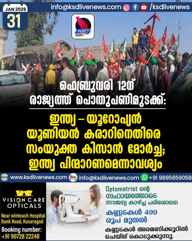 ഫെബ്രുവരി 12ന് രാജ്യത്ത് പൊതുപണിമുടക്ക്: ഇന്ത്യ-യൂറോപ്യൻ യൂണിയൻ കരാറിനെതിരെ സംയുക്ത കിസാൻ മോര്ച്ച; ഇന്ത്യ പിന്മാറണമെന്നാവശ്യം