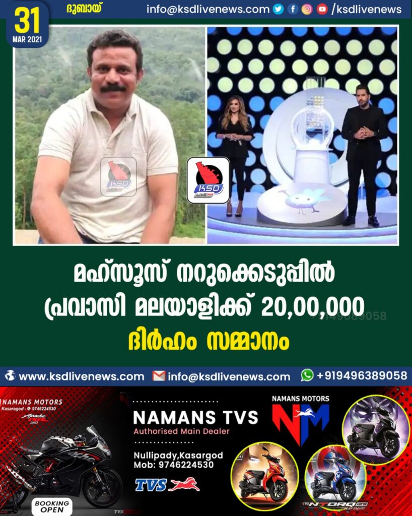 മഹ്സൂസ് നറുക്കെടുപ്പില് പ്രവാസി മലയാളിക്ക് 20,00,000 ദിര്ഹം സമ്മാനം