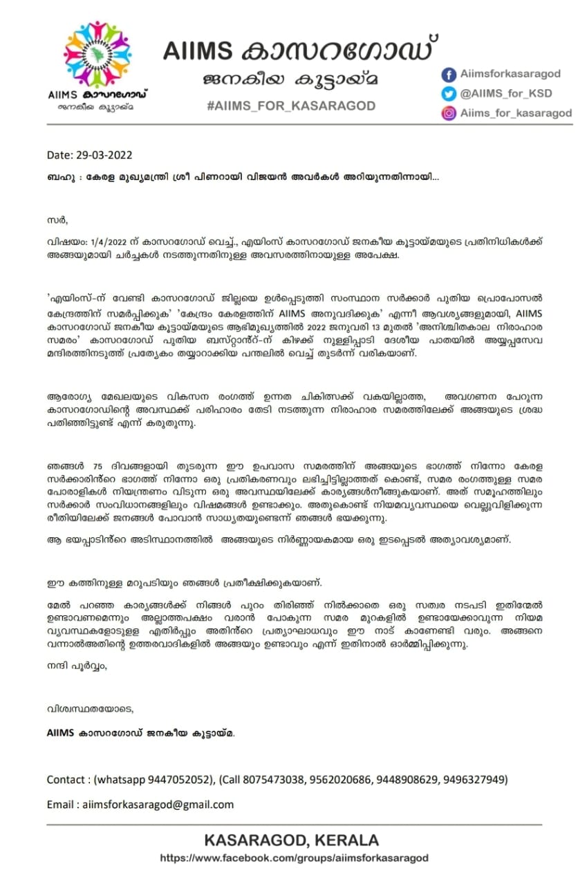 ജനക്ഷേമവും ആരോഗ്യ മേഖലയിലെ വികസനവും സംസ്ഥാന ഭരണ നേതാവിനോട് ജനാതിപത്യ അവകാശത്തോടെ മാന്യമായി ആവശ്യപ്പെടുന്ന സമര മാർഗ്ഗത്തിൽ തടസ്സം സൃഷ്ട്ടിക്കരുതെന്ന് അധികാരികളോട് ആവശ്യപ്പെടുകയാണ്. കാസറഗോഡ് വരുന്ന ഏപ്രിൽ 1 ന് എയിംസ് കൂട്ടായ്മ ഭാരവാഹികൾക്ക് കാണാൻ സമയം അനുവദിക്കണമെന്ന് മുഖ്യമന്ത്രിയോട് ആവശ്യപ്പെട്ടിട്ടുണ്ടെന്ന് സംഘാടക സമിതി ഭാരവാഹികളായ അമ്പലത്തറ കുഞ്ഞികൃഷ്ണൻ, നാസർ ചെർക്കളം എന്നിവർ അറിയിച്ചു.